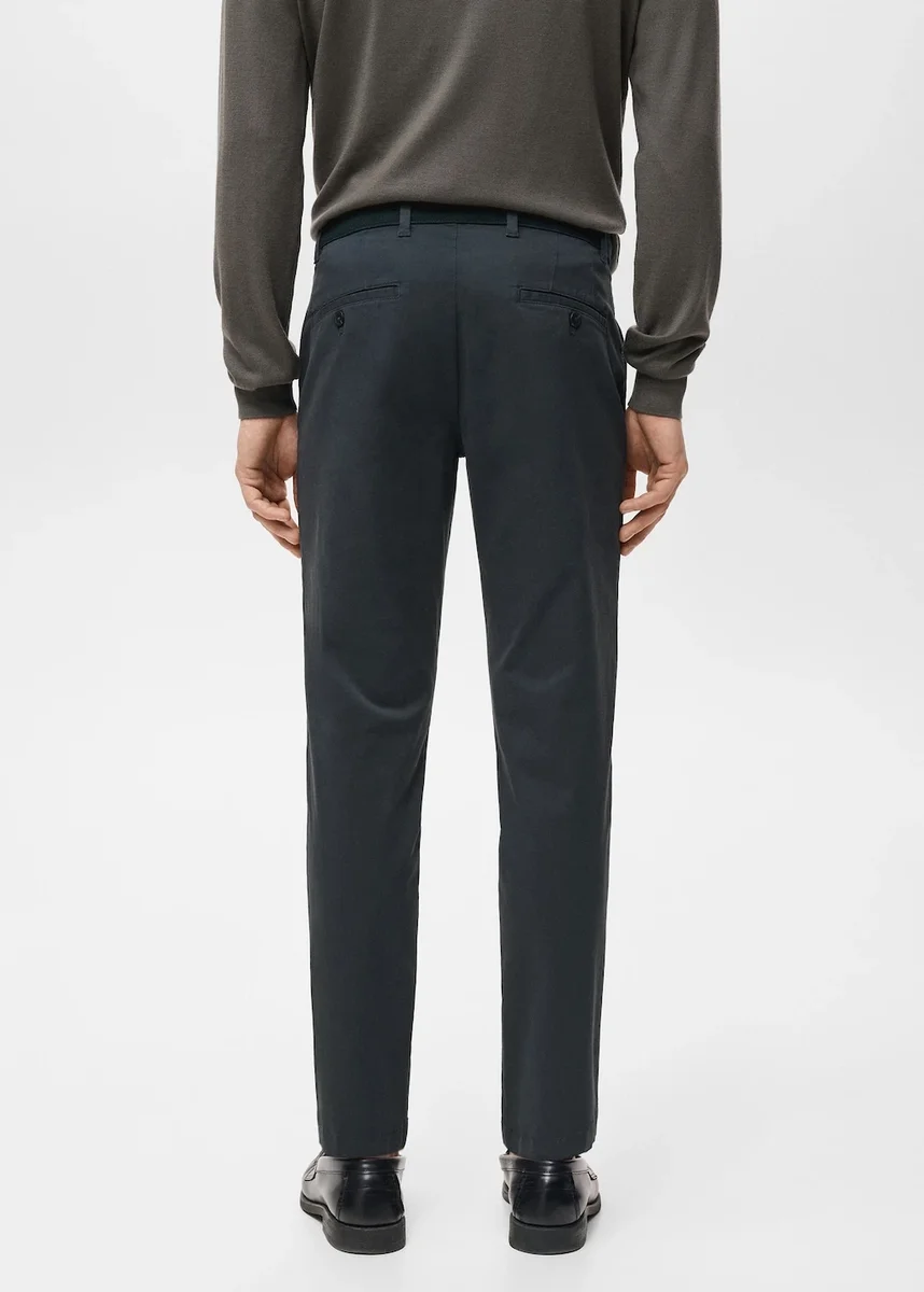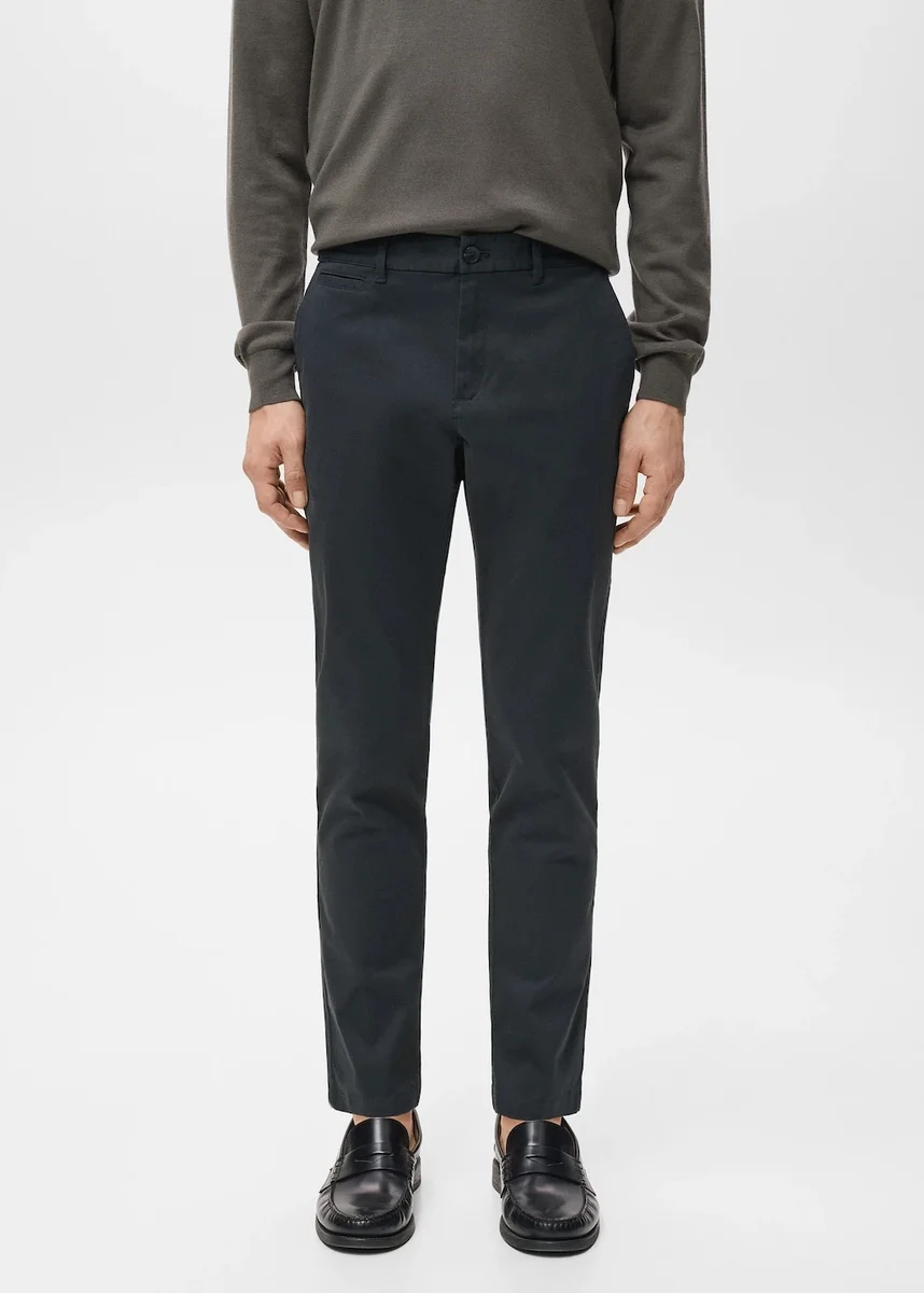 Styl chino. Krój zwężany: szeroki u góry, zwężający się od kolan do kostek. Tkanina bawełniana. Szlufki. Talia z regulowanym wewnętrznym sznurkiem. Zapięcie na zamek błyskawiczny i guzik. Miękka gumka z przodu w pasie dla dodatkowego komfortu i wsparcia rosnącego brzuszka. Kieszeń na monety na wysokości bioder. Dwie kieszenie z przodu. Dwie kieszenie z klapkami zapinanymi na guziki z tyłu. Wąski krój. Regularny stan. Standardowa długość.