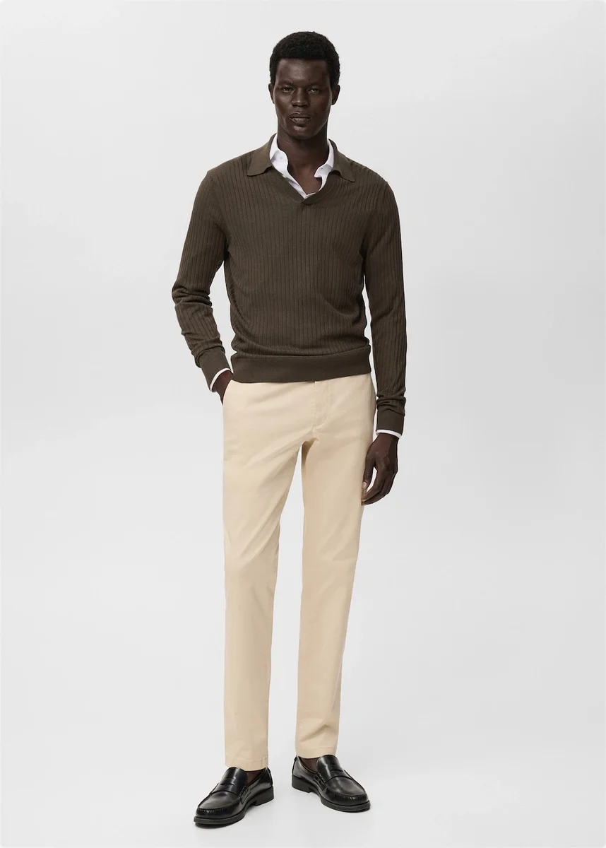 Krój slim fit. Styl chino. Elastyczna bawełna. Szlufki. Dwie kieszenie boczne. Kieszeń na monety. Dwie kieszenie z tyłu. Zapięcie na zamek błyskawiczny i guzik.