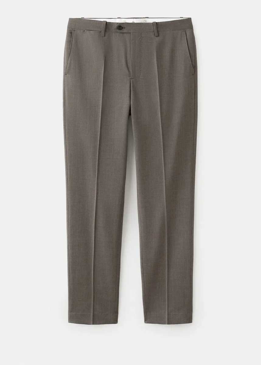 Krój slim fit. 100% wełna dziewicza. Wyprasowane paski z przodu i z tyłu. Dwie kieszenie boczne. Dwie kieszenie z patką i guzikiem z tyłu. Szlufki. Podwójne zapięcie na guziki i zamek błyskawiczny.