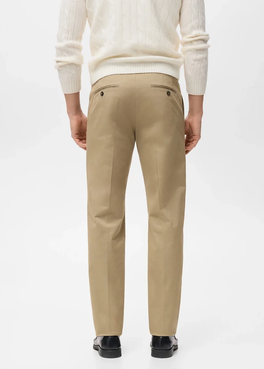 Tkanina bawełniana. Regularny krój. Wyprasowane paski z przodu i z tyłu. Zapięcie z przodu na zamek błyskawiczny i guzik. Szlufki. Dwie kieszenie boczne. Dwie kieszenie z tyłu z guzikiem.p>
