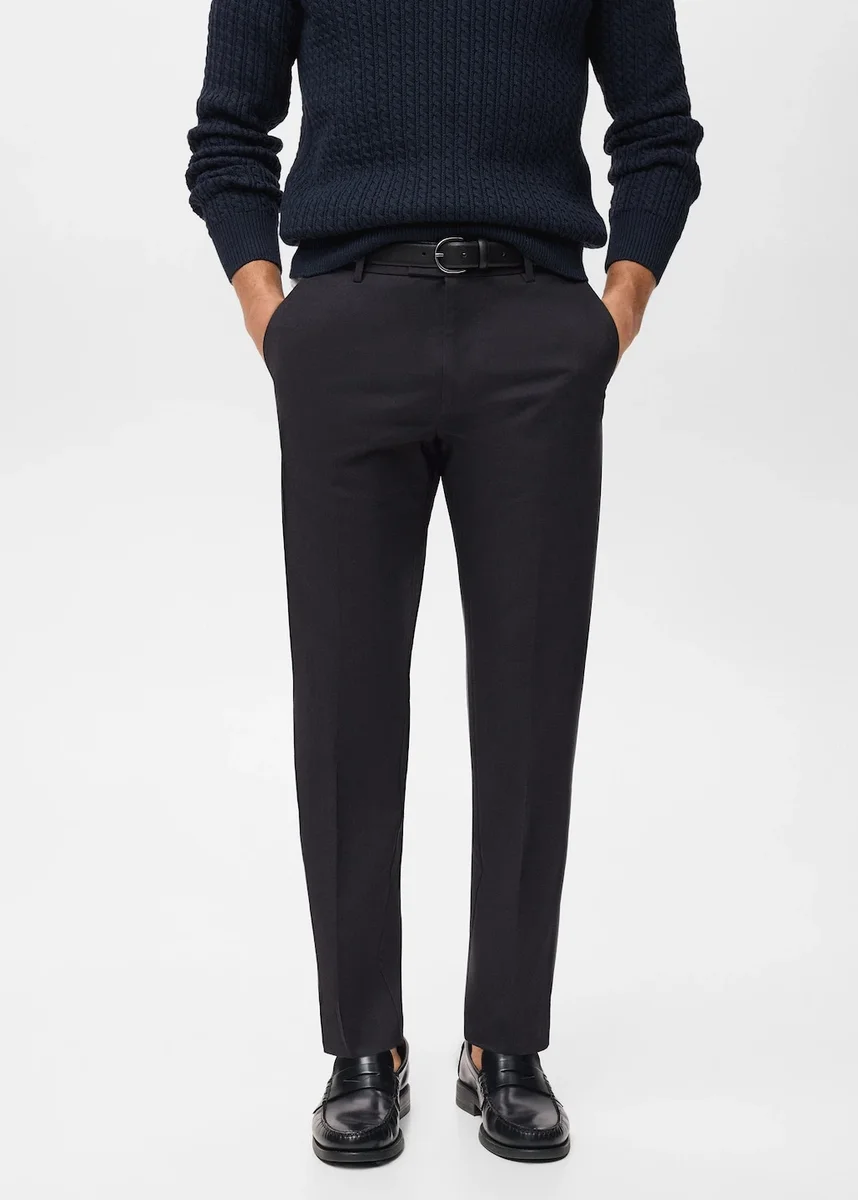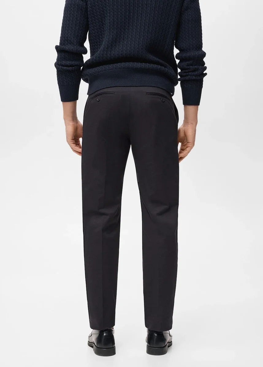 Tkanina bawełniana. Regularny krój. Wyprasowane paski z przodu i z tyłu. Zapięcie z przodu na zamek błyskawiczny i guzik. Szlufki. Dwie kieszenie boczne. Dwie kieszenie z tyłu z guzikiem.p>