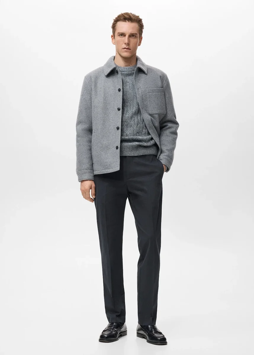 Kolor granatowy jest dostępny wyłącznie w sprzedaży internetowej. Regularny krój. Tkanina z mieszanki bawełny. Wyprasowane paski z przodu i z tyłu. Dwie kieszenie boczne. Dwie kieszenie z patką i guzikiem z tyłu. Szlufki. Zapięcie z przodu na zamek błyskawiczny i guzik.