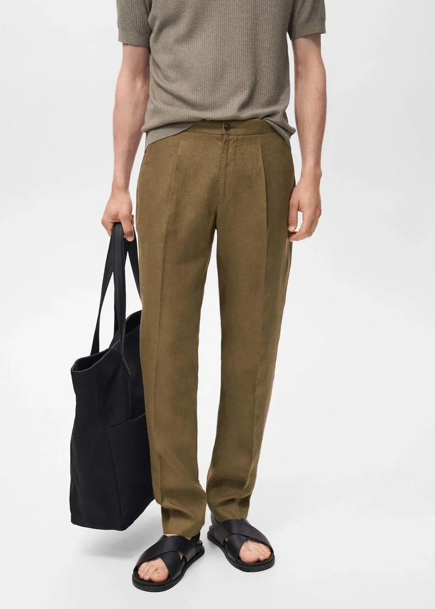 Krój slim fit. 100% len. Kolekcja krawiecka. Elastyczny pas z tyłu. Zapięcie na guzik i zamek błyskawiczny. Dwie kieszenie boczne. Plisa z przodu. Dwie kieszenie z tyłu zapinane na guzik.