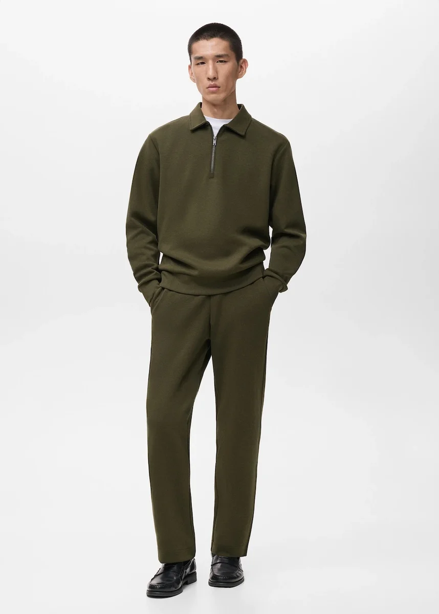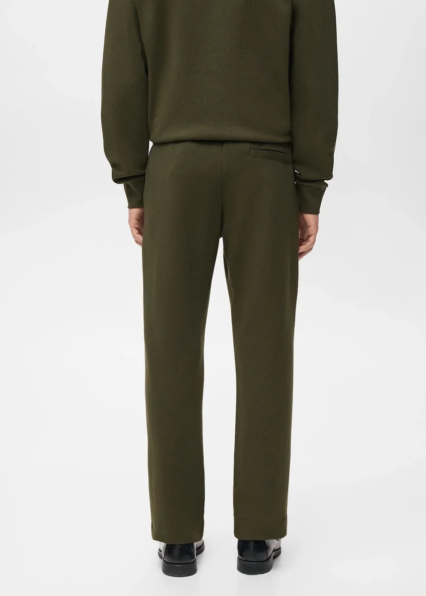 Tkanina z mieszanki bawełny. Krój jogger. Prosta sylwetka. Elastyczny pas z regulowanym wewnętrznym sznurkiem. Dwie kieszenie boczne. Naszywana kieszeń z tyłu.