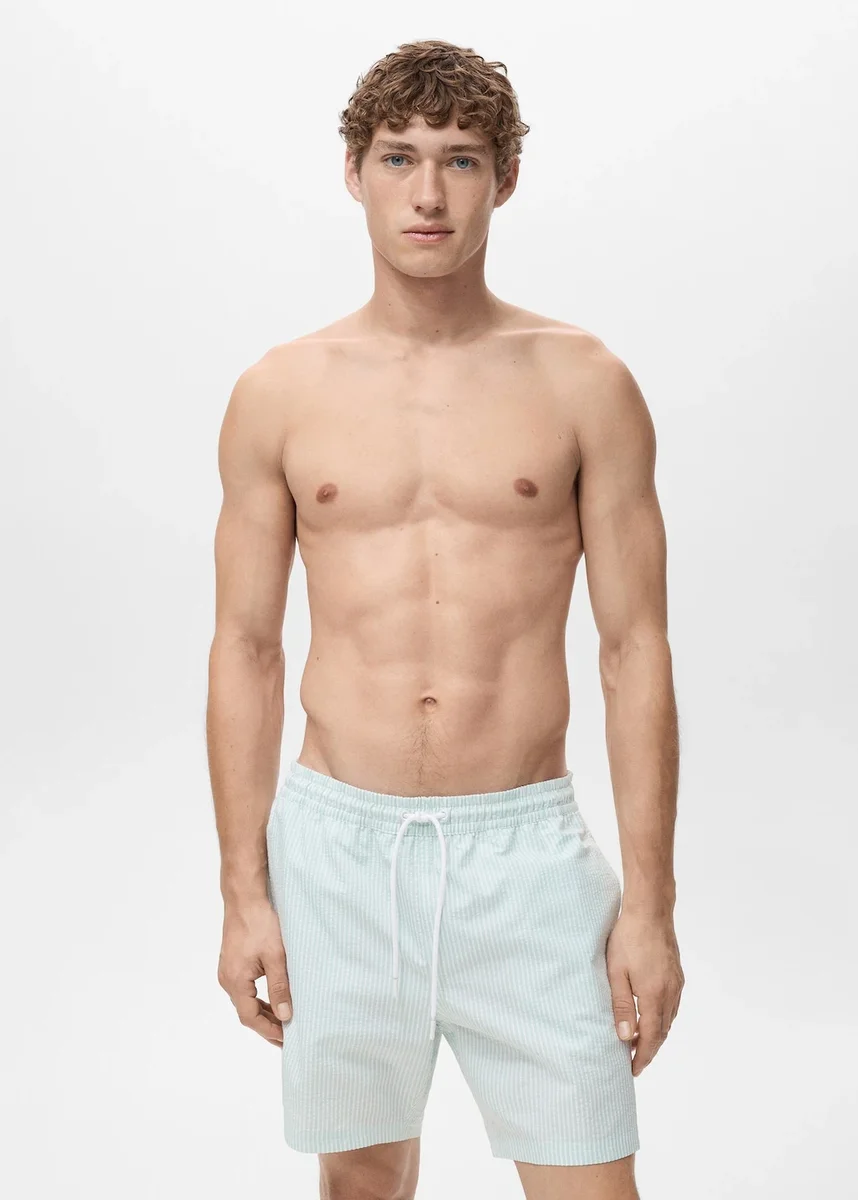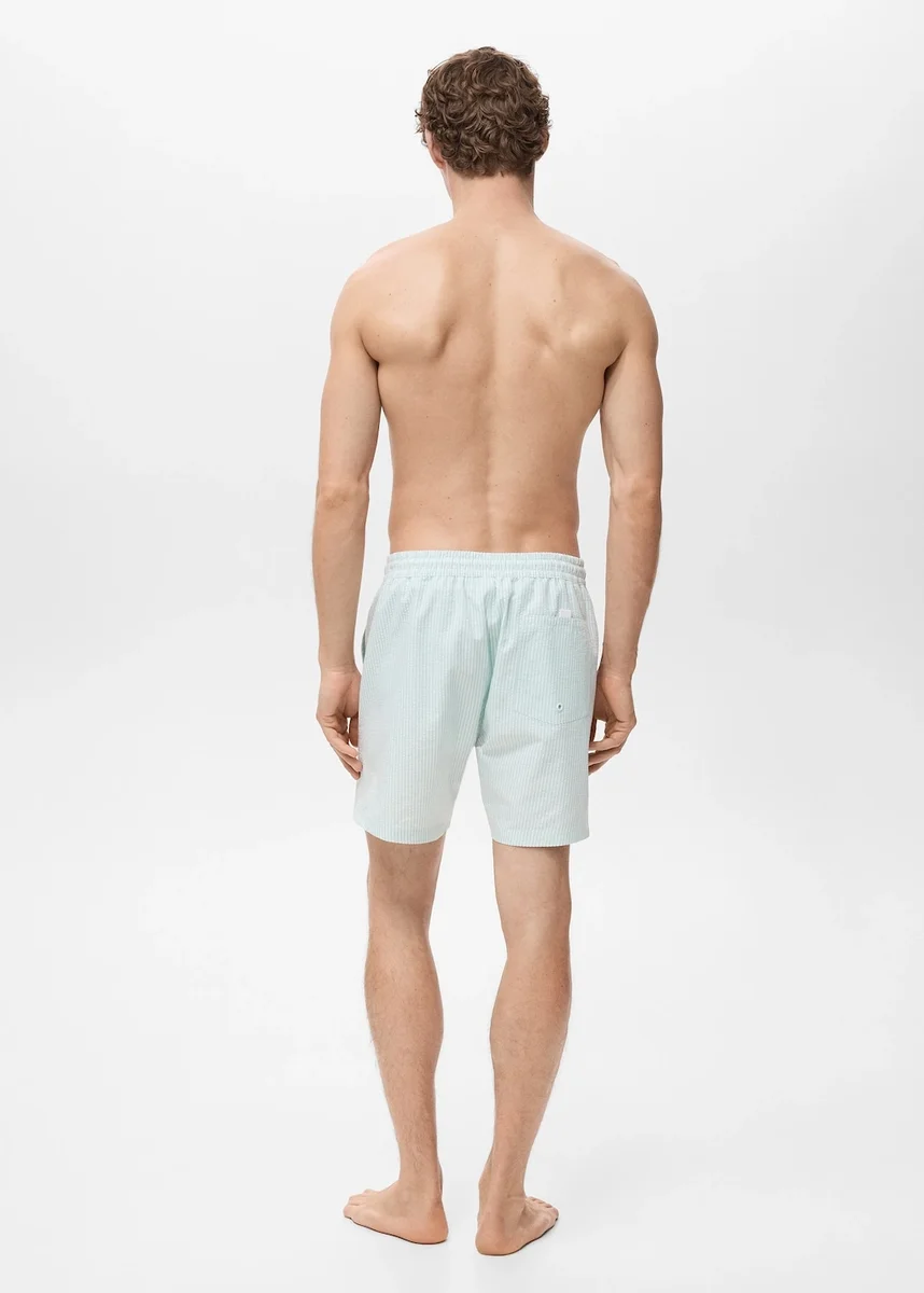 Krój typu bokserki. Tkanina z mieszanki bawełny. Efekt seersucker. Elastyczny pas z regulowanym sznurkiem. Dwie kieszenie boczne. Naszywana kieszeń z tyłu z zapięciem na rzep. Małe rozcięcia po bokach u dołu.