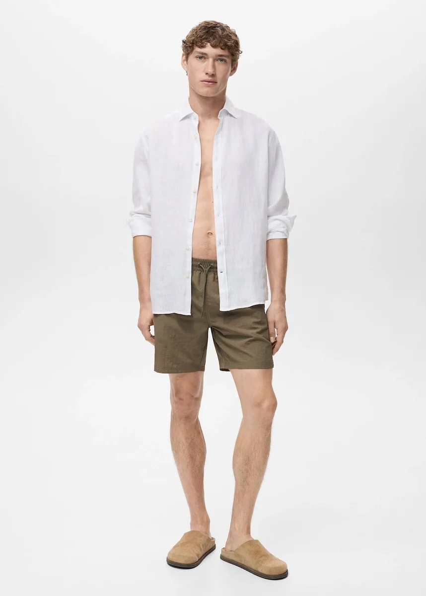 Typ bokserki. Elastyczny pas z regulowanym sznurkiem. Dwie kieszenie boczne. Naszywana kieszeń z tyłu z zapięciem na rzep. Małe rozcięcia po bokach u dołu. Produkt promocyjny