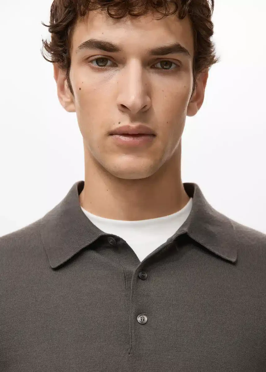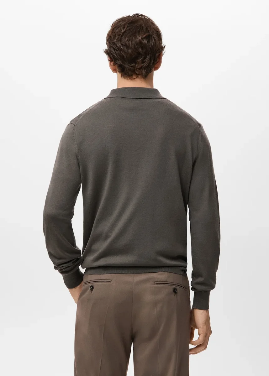Regularny krój. 100% wełna merynosowa. Cienka dzianina. Kołnierzyk polo zapinany na guziki. Ściągacze przy rękawach i u dołu. Elastyczny, prosty dół.
