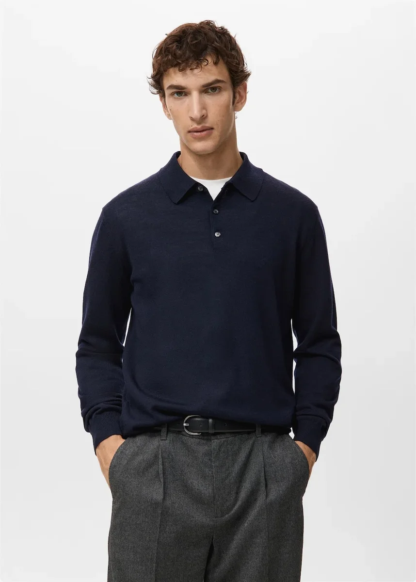 Regularny krój. 100% wełna merynosowa. Cienka dzianina. Kołnierzyk polo zapinany na guziki. Ściągacze przy rękawach i u dołu. Elastyczny, prosty dół.