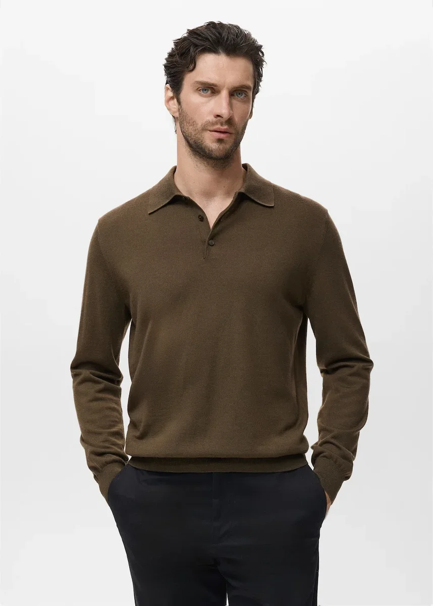 Krój regularny. 100% wełna merynosowa. Cienka dzianina. Kołnierzyk polo zapinany na guziki. Długi rękaw. Niefiniszowane rękawy. Elastyczne mankiety.