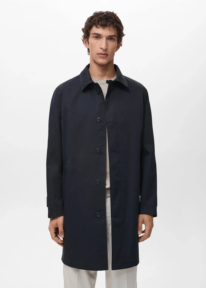 Kolor beżowy jest dostępny wyłącznie w sprzedaży internetowej. Wodoodporny: techniczna tkanina wodoodporna. Tkanina z mieszanki bawełny. Długi fason. Kołnierzyk koszulowy. Zapięcie na guziki z przodu. Mankiety zapinane na guziki. Dwie kieszenie boczne. Podszewka wewnętrzna.