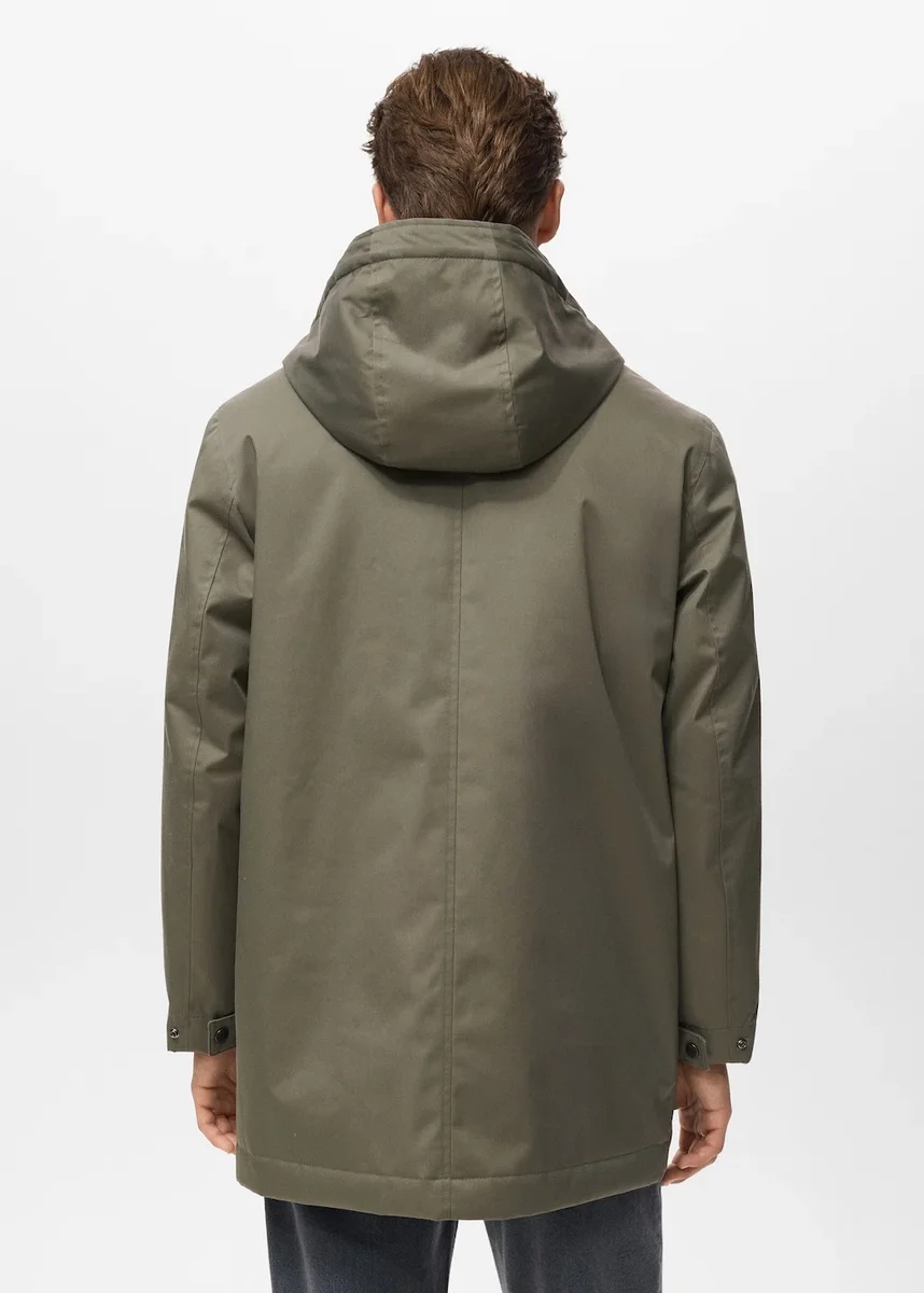 Prosty krój. Z kapturem. Wodoodporność: Techniczna tkanina wodoodporna. Wewnętrzna kieszeń zapinana na guzik. Z podszewką wewnętrzną. Dwie boczne kieszenie z klapkami. Długi rękaw z regulowanymi mankietami. Ukryty zamek błyskawiczny i zapięcie na guziki. Czarny piątek