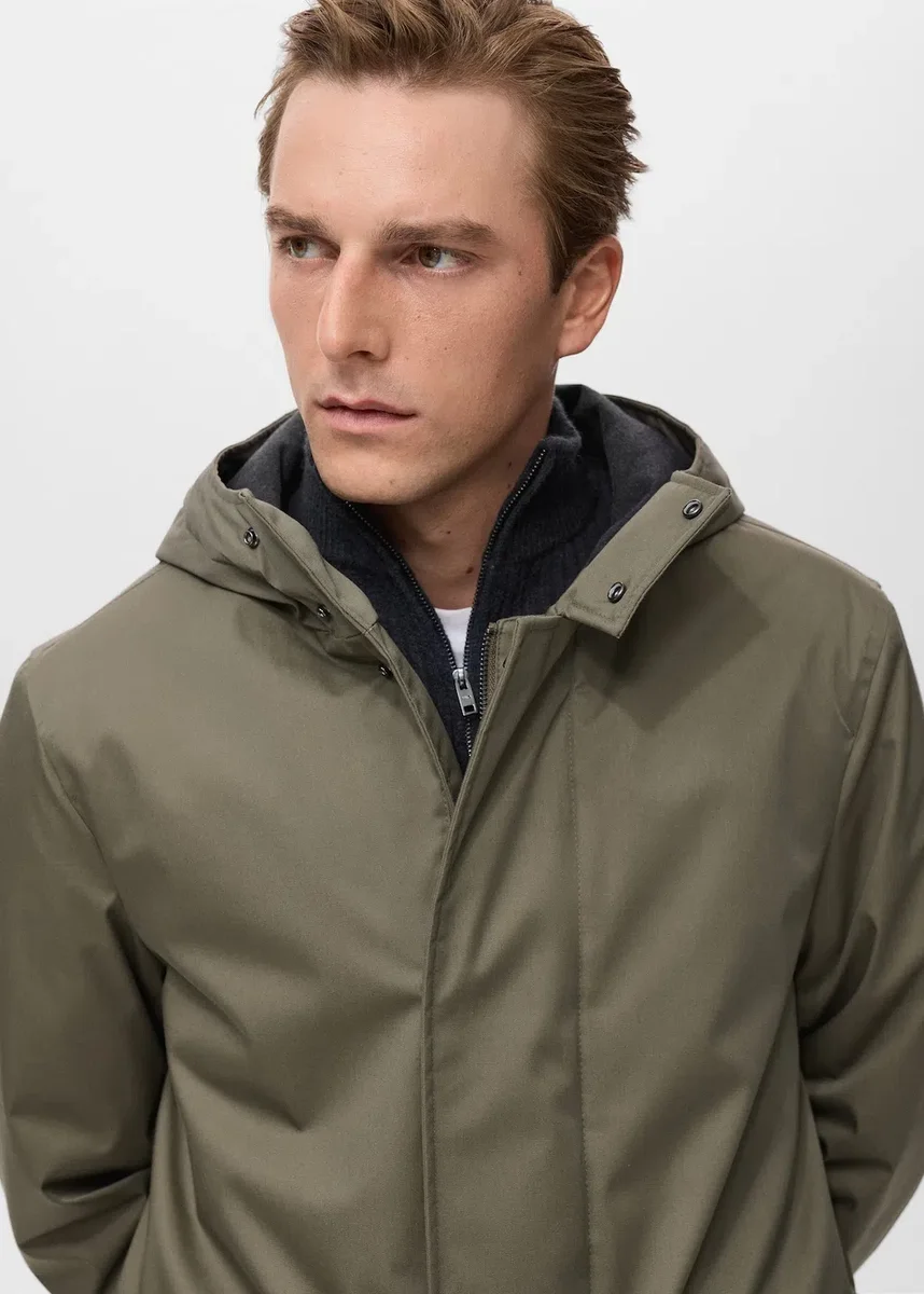Prosty krój. Z kapturem. Wodoodporny: techniczna tkanina wodoodporna. Wewnętrzna kieszeń zapinana na guziki. Z podszewką wewnętrzną. Dwie boczne kieszenie z klapkami. Długi rękaw z regulowanymi mankietami. Ukryte zapięcie na zamek błyskawiczny i guziki. Czarny piątek.