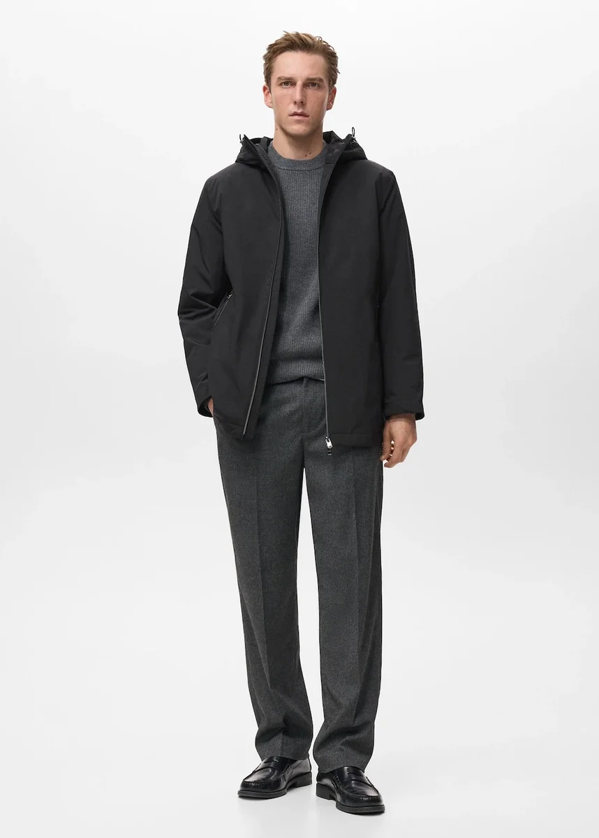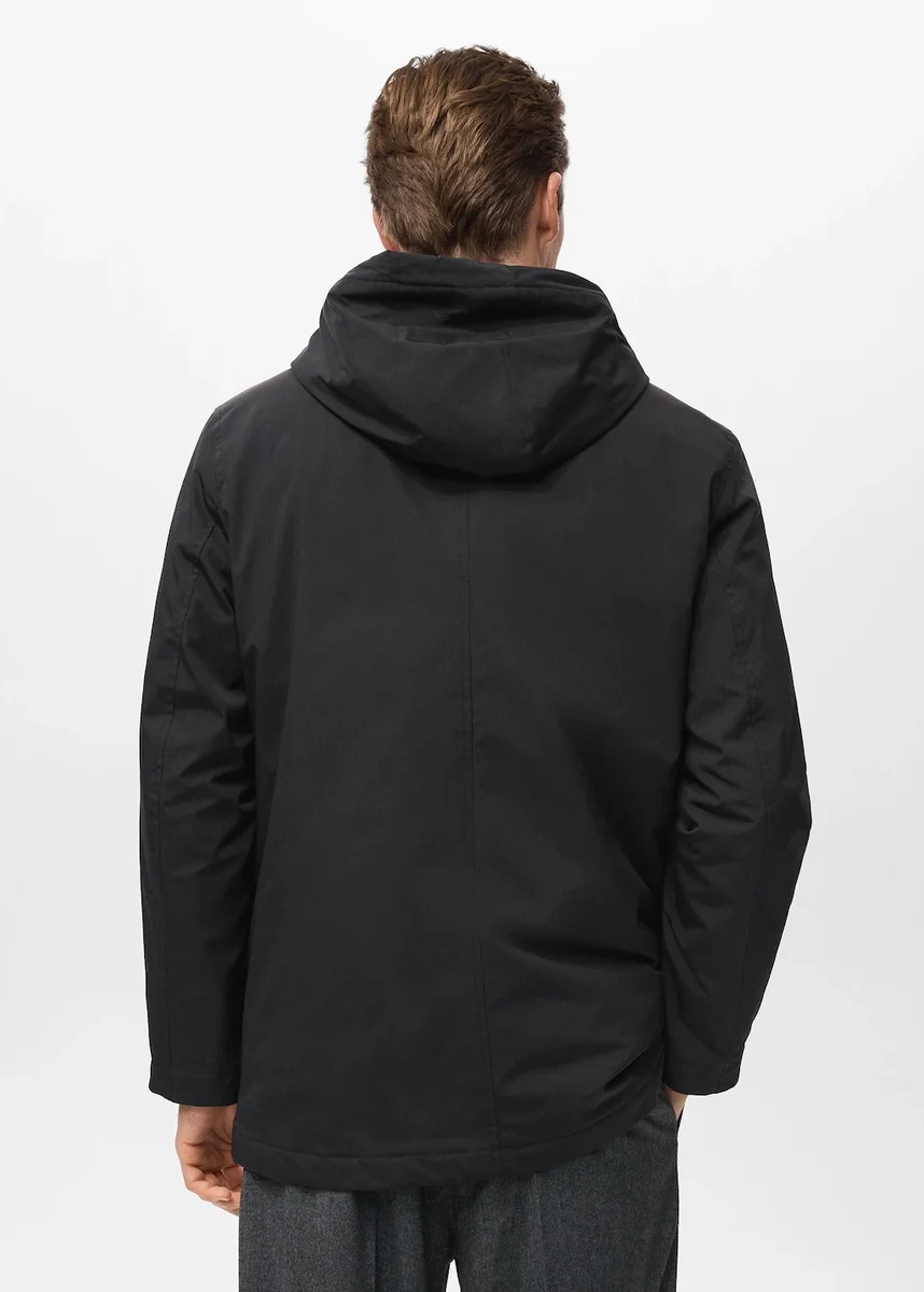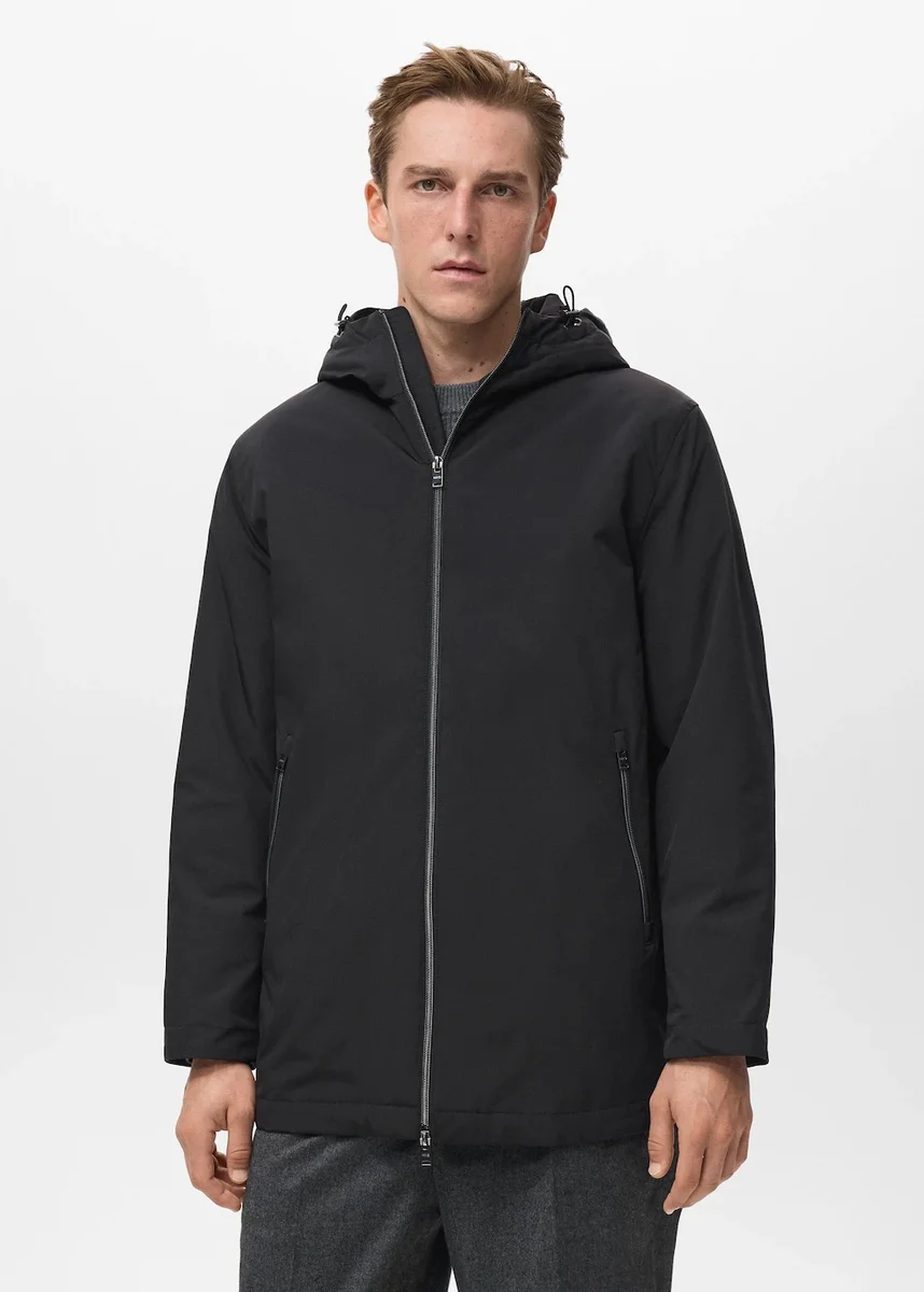 Prosty krój. Wodoodporność: Techniczna tkanina wodoodporna. Z wypełnieniem. Kaptur ze sznurkiem. Dwie boczne kieszenie zapinane na zamek błyskawiczny. Wewnętrzna kieszeń zapinana na zamek błyskawiczny. Zapięcie z przodu na zamek błyskawiczny