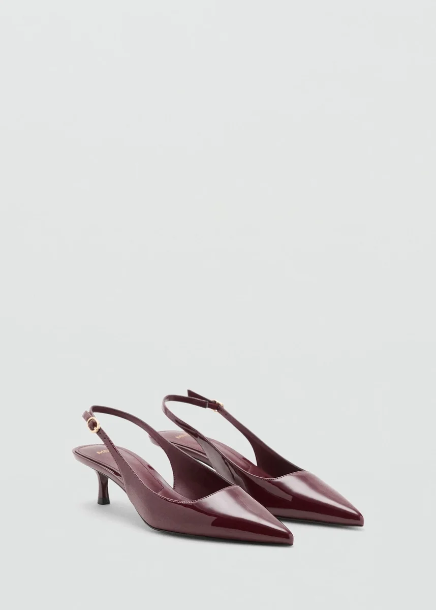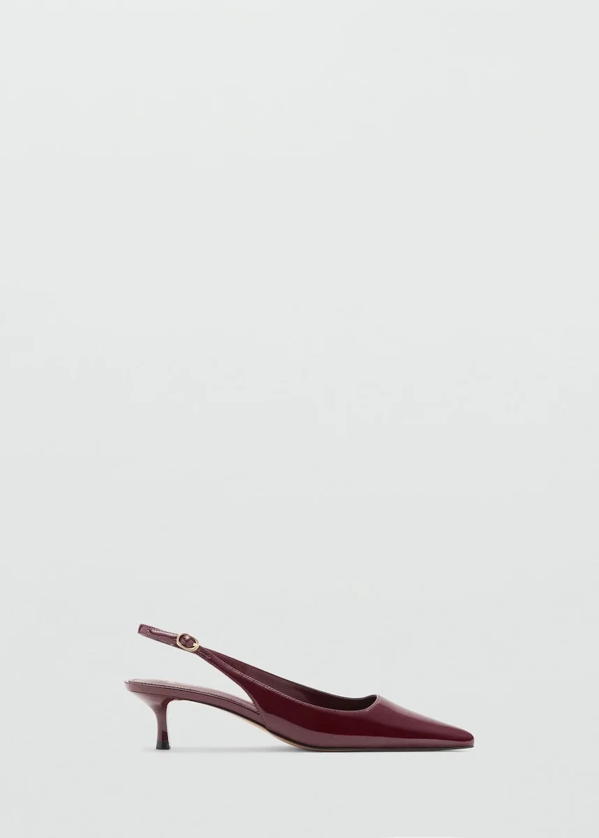 Efekt lakierowanej skóry. Konstrukcja typu slingback. Spiczasty nosek. Obcas typu kitten heel. Wysokość obcasa: 5 cm. Zapięcie na klamrę w okolicy kostki.