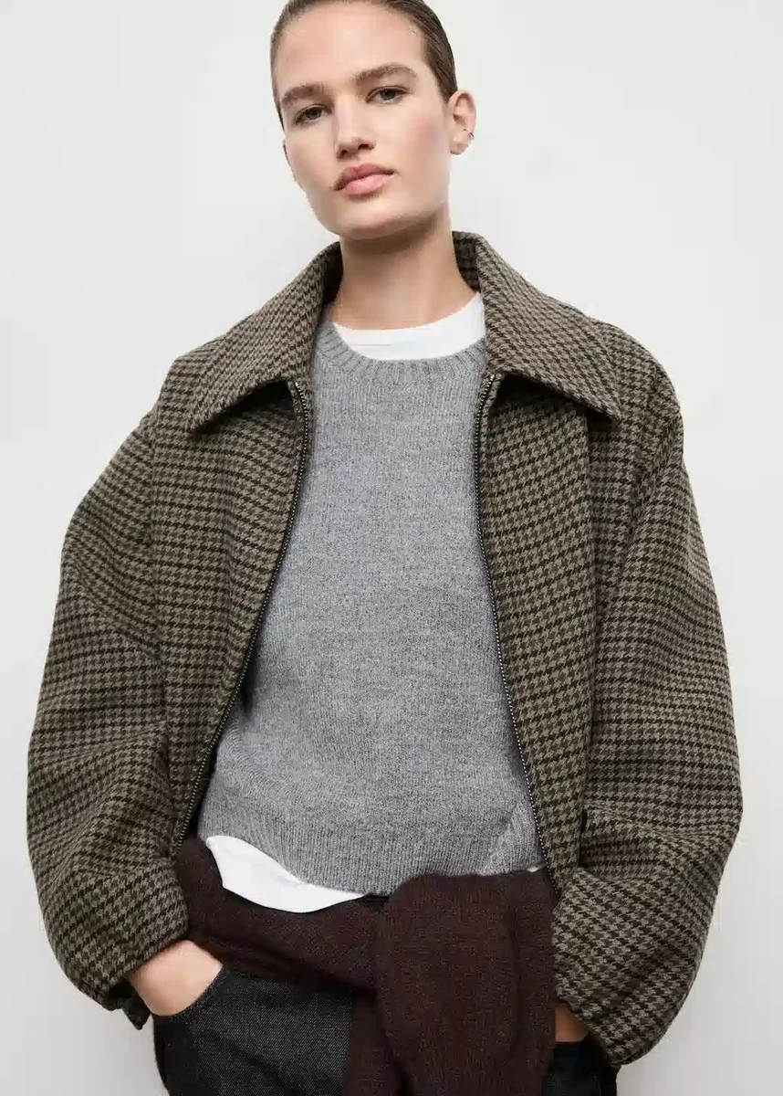 Mieszanka wełny. Tkanina w pepitkę. Krój bomberki. Kołnierzyk koszulowy. Długie rękawy z elastycznymi mankietami. Elastyczny dół. Zapięcie na zamek błyskawiczny z przodu. Podszewka wewnętrzna