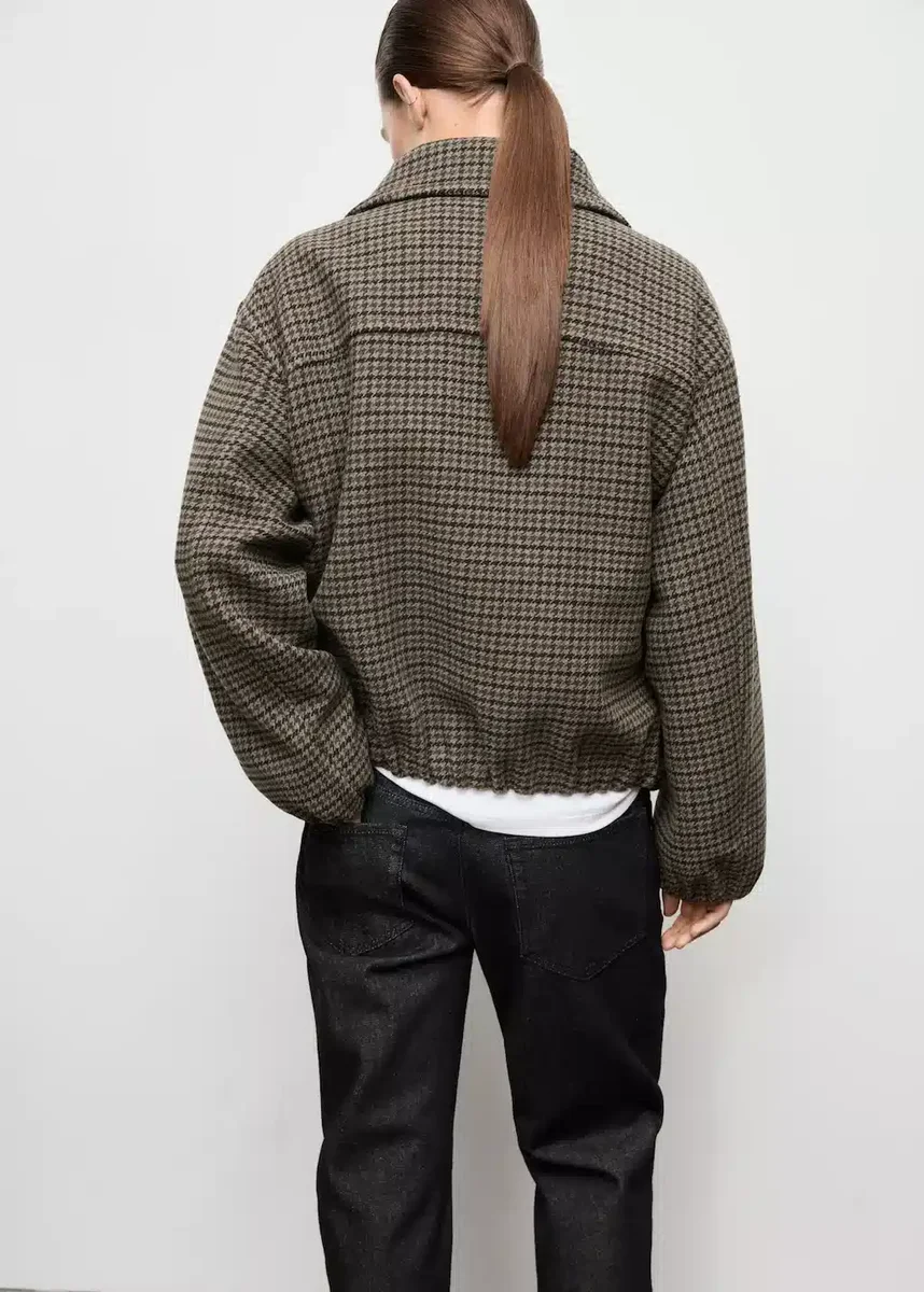 Mieszanka wełny. Tkanina w pepitkę. Krój bomberki. Kołnierzyk koszulowy. Długie rękawy z elastycznymi mankietami. Elastyczny dół. Zapięcie na zamek błyskawiczny z przodu. Podszewka wewnętrzna.